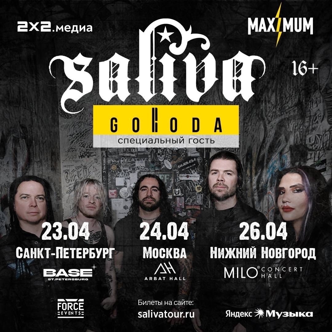 Отличная новость для фанатов качественного западного альтернативного рока: культовая американская группа Saliva даст этой весной сразу три концерта в России! 📍 23 апреля — Санкт-Петербург📍 24 апреля — Москва📍 26 апреля — Нижний Новгород Зрителей накроет волна зубодробительных риффов, суперхитов Click Click Boom, Always, Superstar и атмосфера настоящего рок-н-ролла. Организатор концертов — концертное агентство Force Events https://vk.ru/forcevents 🎟️ Купить билет https://salivatour.ru/